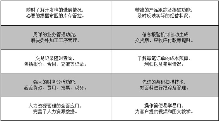 系统结合面料行业的特点与管理需求,满足不同层次、不同部门的管理人员的工作需要,为提高日常工作效率和科学的管理决策,提供有效的管理信息化解决方案,帮助企业实现业务快速反映,让管理变得简单,让财务更加清晰。系统主要涵盖商品管理、销售管理、采购管理、生产与委外管理、质量管理、仓库管理、财务管理、客户及供应商管理等功能。