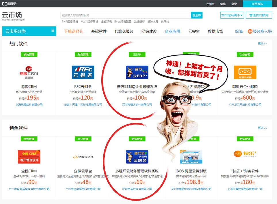 惊! 普方软件在阿里云市场上架短短1个月时间,就得到用户的好评,竟然纷纷神速排列到阿里云市场首页排行榜上,最新普方云ERP系列S3、V5、D9邀你一起加入,共同品鉴云时代高效的工作体验!