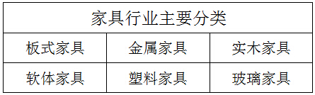 板式家具、金属家具、实木家具、软体家具、塑料家具、玻璃家具