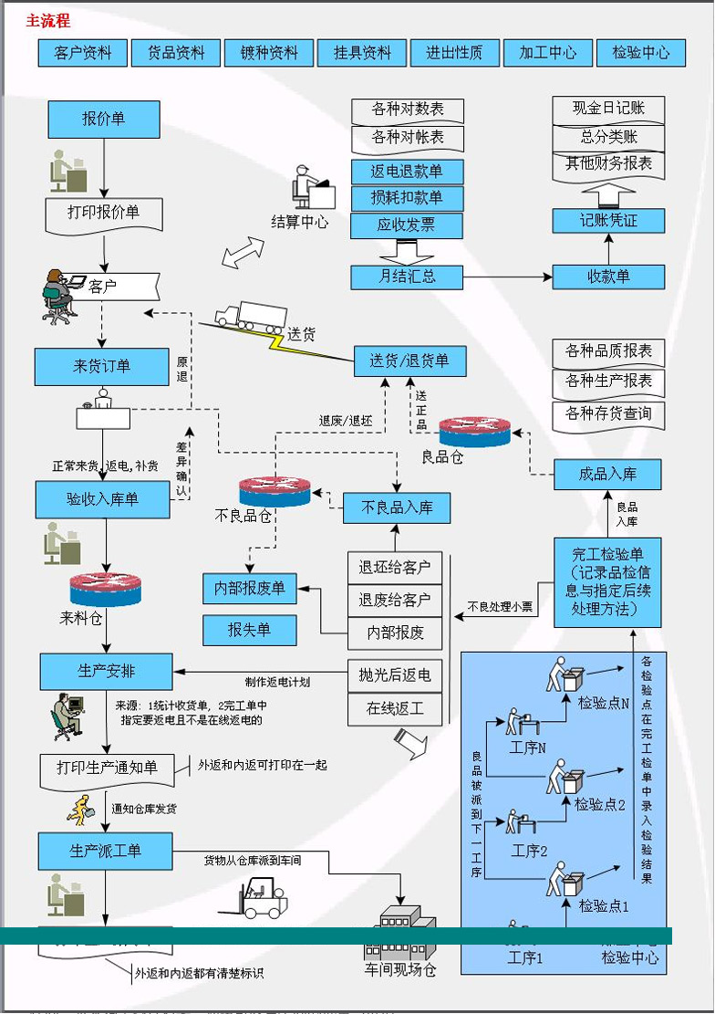 i. 切合电镀厂的操作流程:收货、返电、补货、送货、退坯、退废、报损、报废对数和对账,等一系列动作,环环